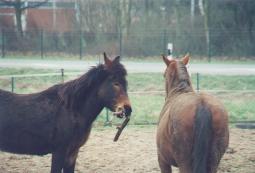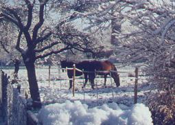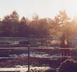 A ber auch die Schattenseite sollen hier nicht ganz unerwähnt bleiben. Der schönen Zeit des durchs Gelände strolchen im Frühling und Sommer folgt die Schlammschlacht im Herbst und Winter. Wenn ihr Pferd sie mit moddernassem Winterfell treuherzig anblickt, legen sie den Sattel getrost wieder weg und rechnen Sie eine Stunde putzen ein. Der Spruch "Lange Striche, kurze Pausen" stammt eindeutig von einem Freizeitreiter mit Offenstallpferden. Das ganze Jahr über muß der Stall gemistet und der Paddock abgeäpfelt werden; wer da die Frage "Wohin mit dem Mist" erst stellt, wenn der Kompost überläuft, der hat ein Problem. Koppeln sind nicht nur zum Grasen da, sie müssen auch gepflegt werden, sonst werden die Geilstellen immer größer. Zäune müssen gezogen, umgesetzt oder geflickt werden. Wenn das alles Sie nicht schreckt, dann Willkommen bei der artgerechten Pferdehaltung. |